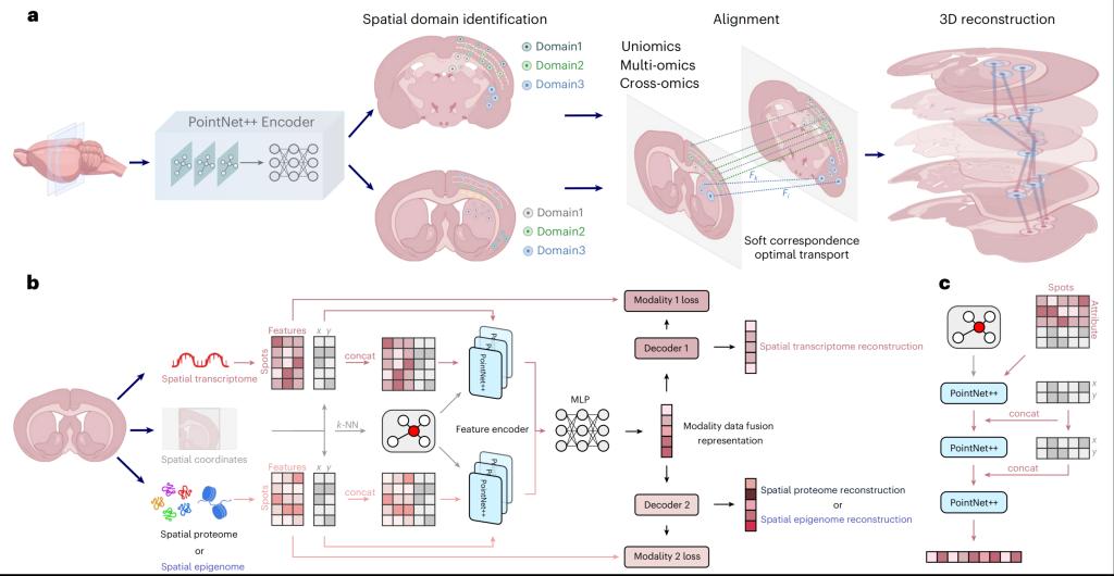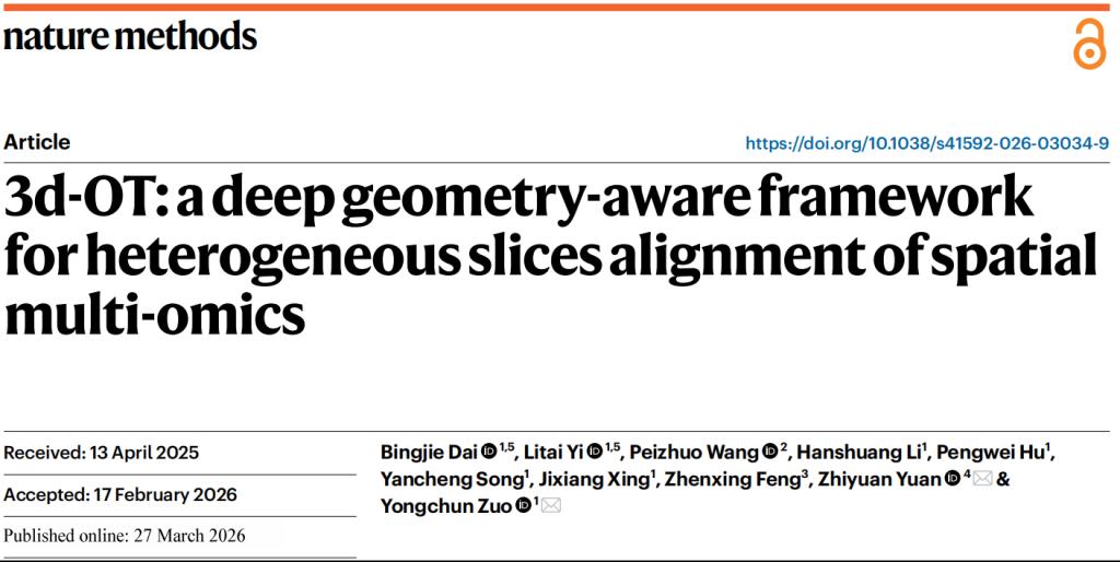3月27日,内蒙古大学生物医学研究院左永春教授团队联合复旦大学原致远研究员,在Nature大子刊《Nature Methods》(IF=32.1, IF5=51.7)上发表题为“3d-OT: a deep geometry-aware framework for heterogeneous slices alignment of spatial multi-omics” 研究论文,在空间组学领域取得重大突破。该研究创新性的为空间组学领域引入了点云模型和软通讯最优传输策略,不仅为空间单组学,多组学的特征提取和空间域识别开拓了全新的思路,更填补了空间多组学异构切片对齐的空白。同时,该算法为空间切片对齐引入了全新的几何结构评估指标chamfer distance,补足了依赖生物标签评估对齐的缺陷。这是我院也是自治区科研机构首次以第一完成单位在Nature Methods上发表论文,实现了学校在该顶级期刊上发表论文的突破,充分体现了相关研究工作的前沿性与创新性。