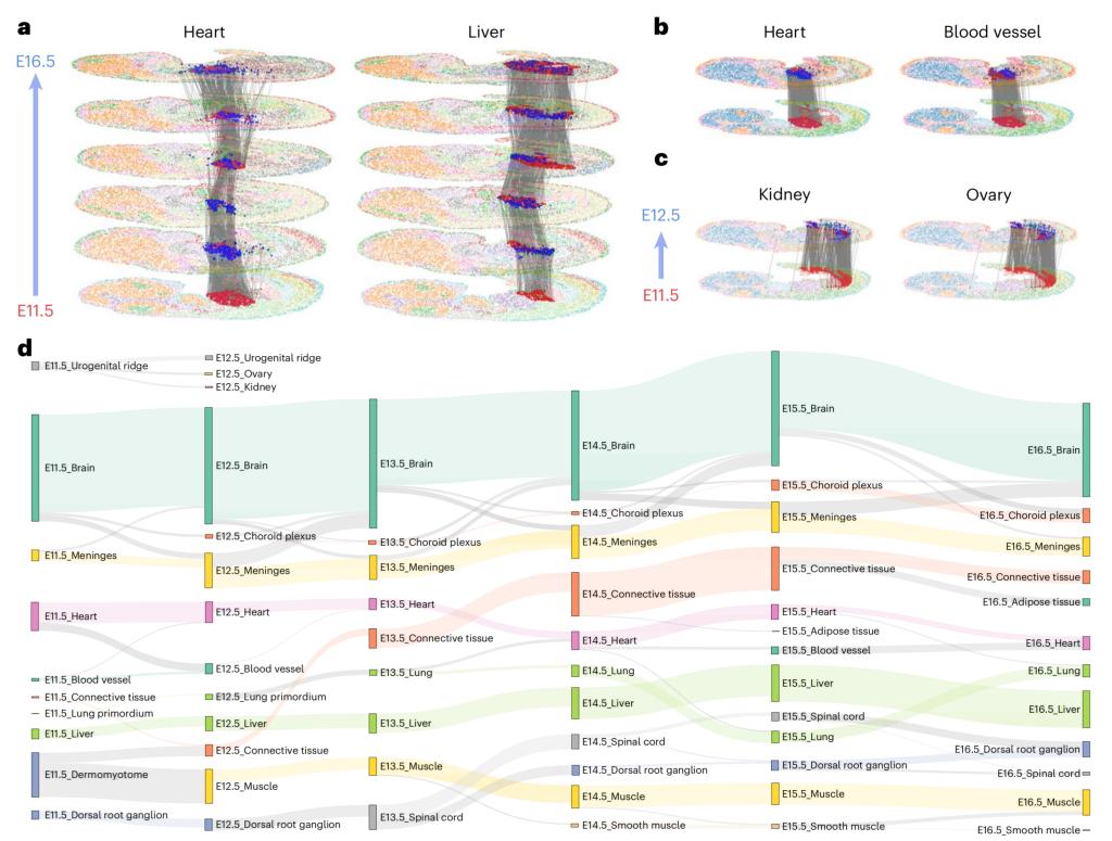 3d-OT在E11.5至E16.5小鼠胚胎时空组学数据中,成功重建了各器官的时空发育轨迹。尽管心脏与肝脏在发育过程中发生了非刚性位置偏移,但3d-OT仍成功捕捉到对应的发育轨迹,且两者在各阶段的空间分布与重建结果高度一致。值得注意的是,E13.5阶段心脏呈现环状结构,3d-OT成功重建出对应的几何结构分布。多个区域的分化现象也被3d-OT成功捕捉:例如E12.5时真皮肌节发育为肌肉和结缔组织,而肌肉在E14.5时进一步分化为平滑肌。此外,3d-OT还成功的捕捉到了某些非发育性排列结果如脉络丛与大脑呈现一定程度的排列特征。在大脑发育过程中,脉络丛会占据侧脑室、第三脑室和第四脑室,并在这些脑室区室中发挥独特功能。